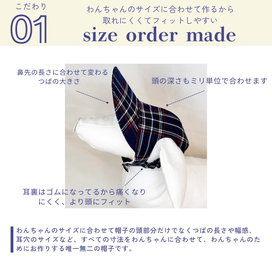当ショップの帽子は全てわんちゃんのサイズをもとにお作りする完全オーダーメイドの商品です。採寸に関しましては、<MEASURING>をご覧ください。