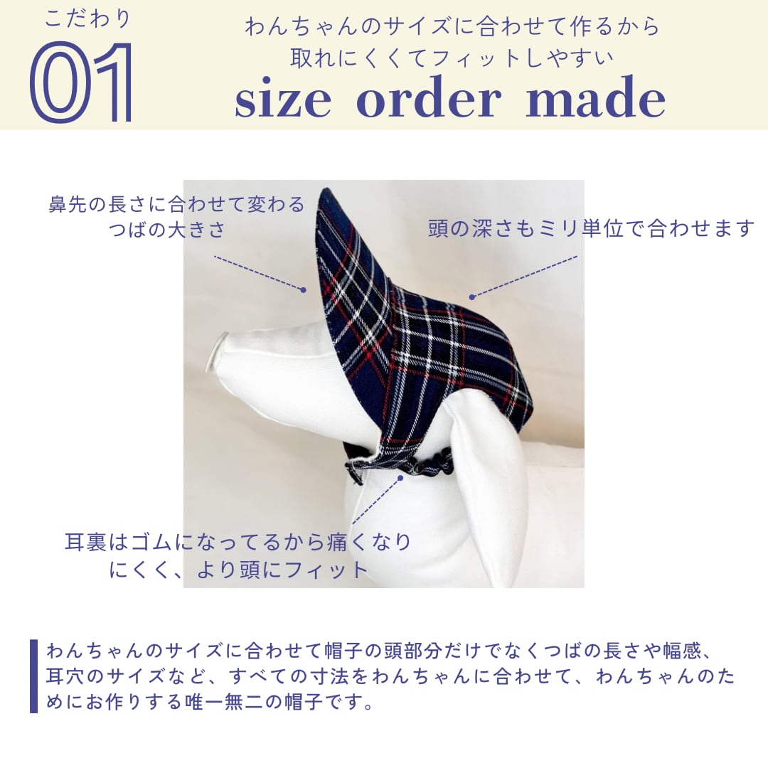 当ショップの帽子は全てわんちゃんのサイズをもとにお作りする完全オーダーメイドの商品です。採寸に関しましては、<MEASURING>をご覧ください。